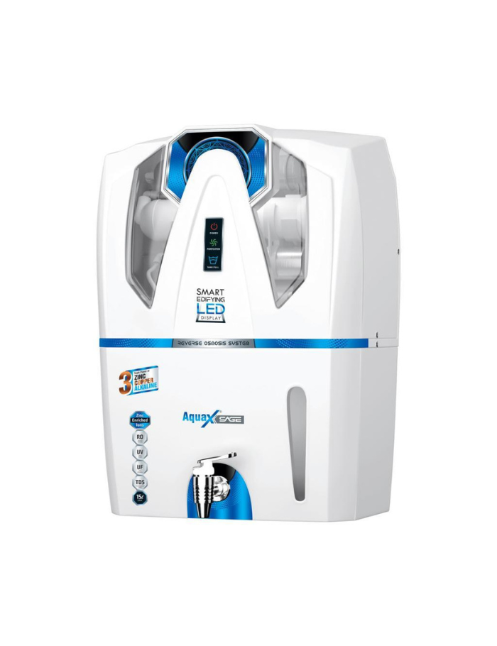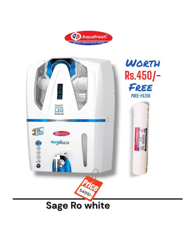 The Sage White RO Water Purifier is designed to provide your household with safe and healthy drinking water. Utilizing a multi-stage purification process, including RO, UV, UF, and TDS adjustment, it effectively removes impurities, bacteria, and viruses. The built-in mineral cartridge ensures the retention of essential minerals, enhancing the taste and quality of the water. With a 12-liter storage tank and a purification capacity of up to 15 liters per hour, it caters to the daily needs of a medium-sized family. Its sleek design allows for easy wall-mount or table-top installation, making it a versatile addition to any kitchen.